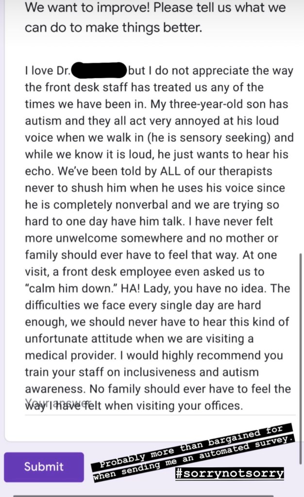 But the thing is, we need to do better. Doctor’s offices need to do better. That woman needs to do better. The waiting room full of staring eyes needs to do better. And society as a whole needs to DO BETTER. Period.